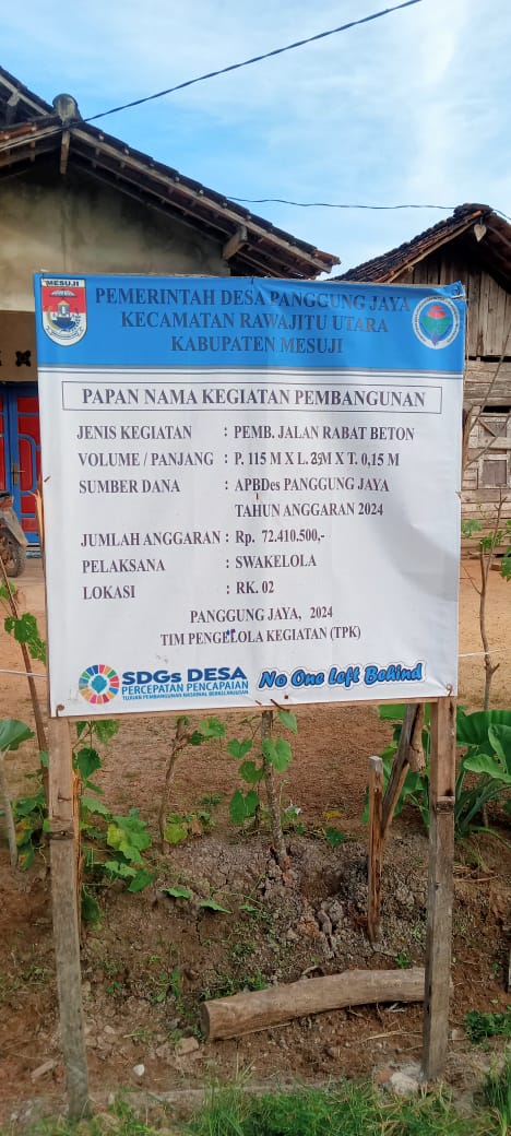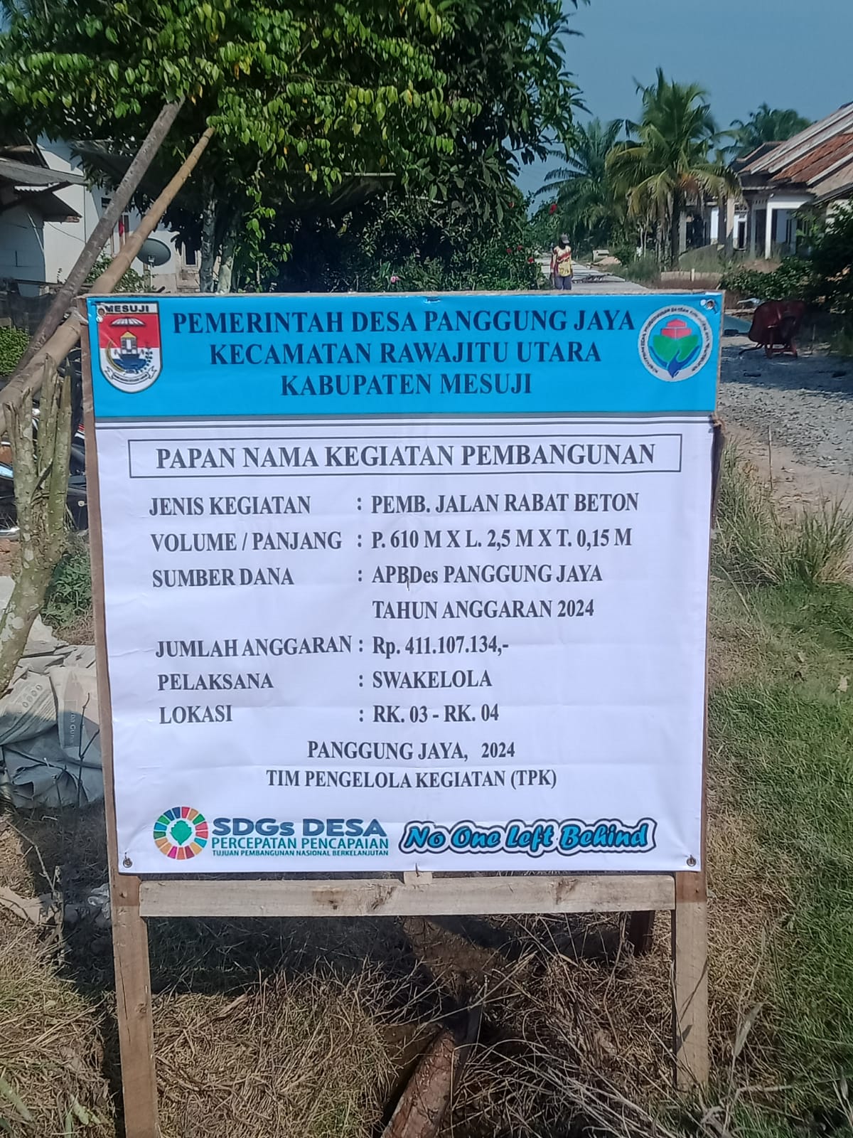Pemerintah Desa Panggung Jaya Kecamatan Rawajitu Utara Kabupaten Mesuji Provinsi Lampung terus  memperbaiki infrastruktur jalan di Desa Panggung Jaya dengan melaksanakan pembangunan jalan rabat beton.