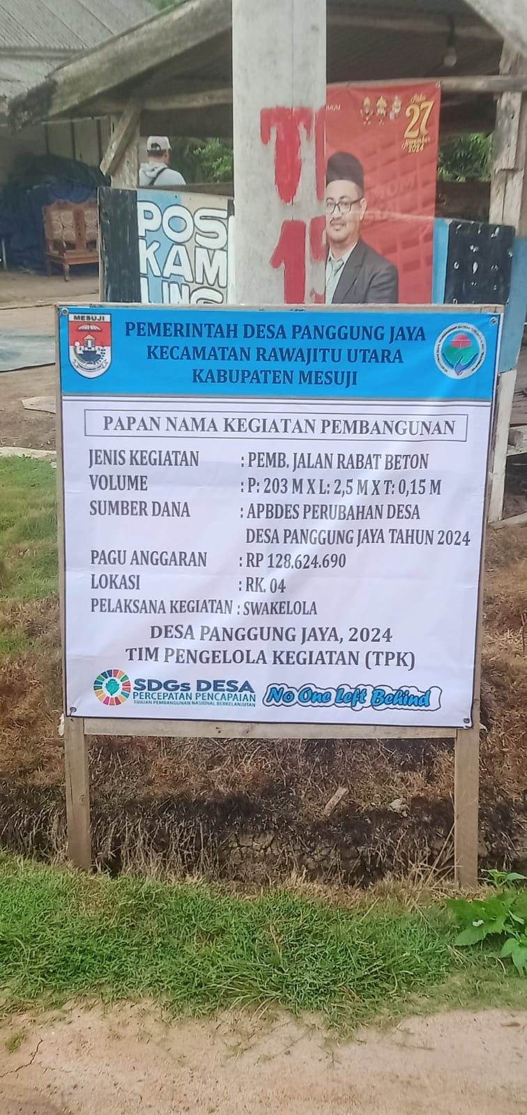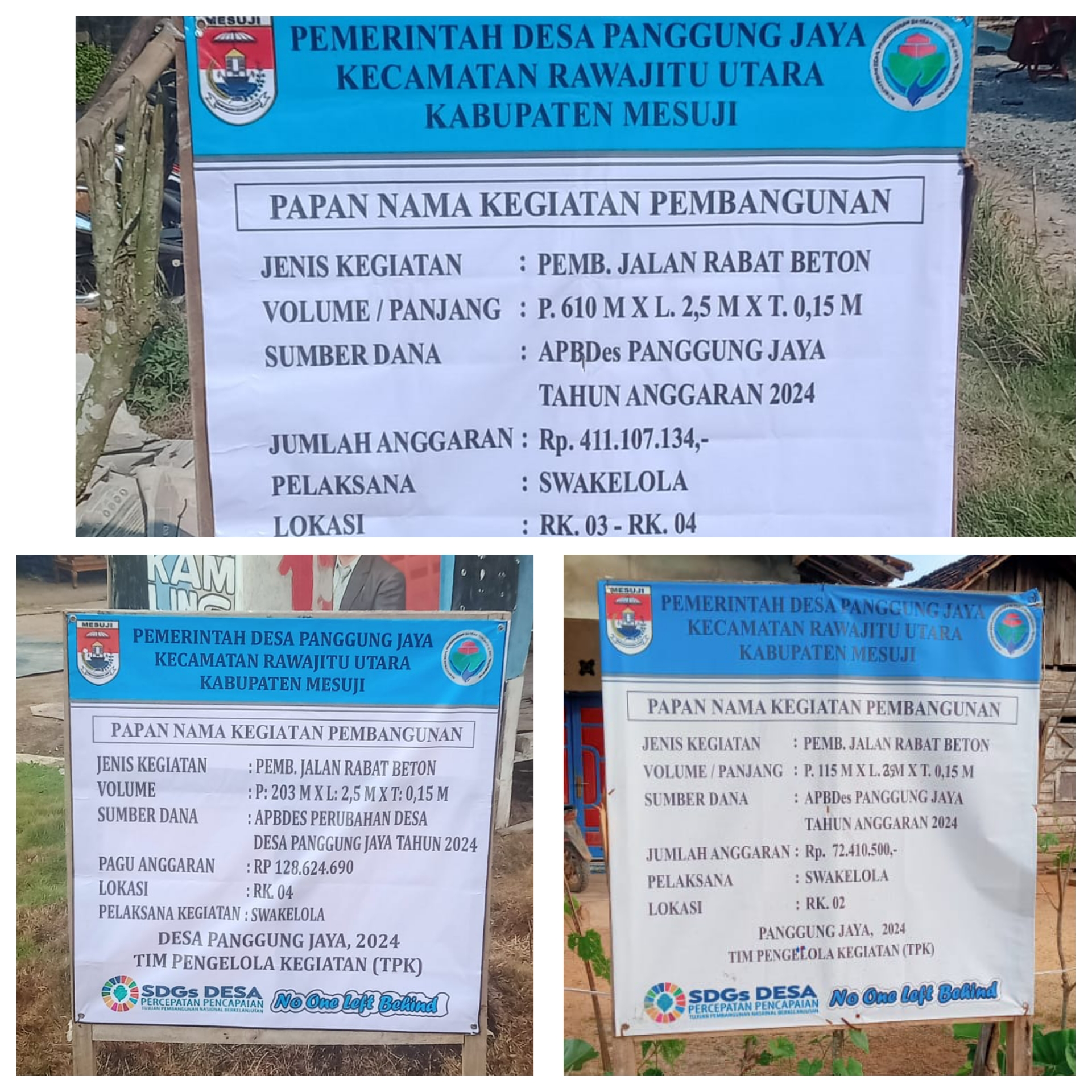 Pemerintah Desa Panggung Jaya Kecamatan Rawajitu Utara Kabupaten Mesuji Provinsi Lampung terus  memperbaiki infrastruktur jalan di Desa Panggung Jaya dengan melaksanakan pembangunan jalan rabat beton.